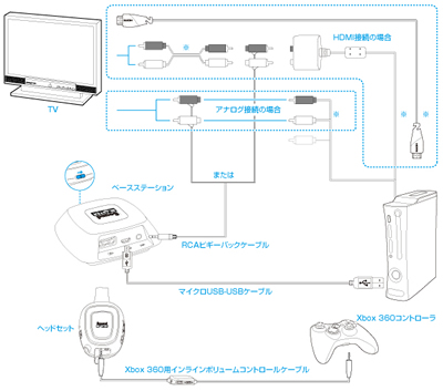 ※上図内「※」印のケーブルは本製品には付属されていません。 PS3、Xbox 360とTVをHDMIケーブルで接続する場合には、別途、株式会社ソニー・コンピュータエンタテインメント社製アクセサリーD端子ケーブル/S端子ケーブル/コンポーネントAVケーブル(PS3の場合)、Microsoft®社製アクセサリーXbox 360® HDMI AVケーブル(Xbox 360の場合)をご使用いただくか、市販のケーブルでTVのヘッドホン出力端子と接続してください。お客様の機器環境によっては、別途ケーブル等が必要な場合があります。