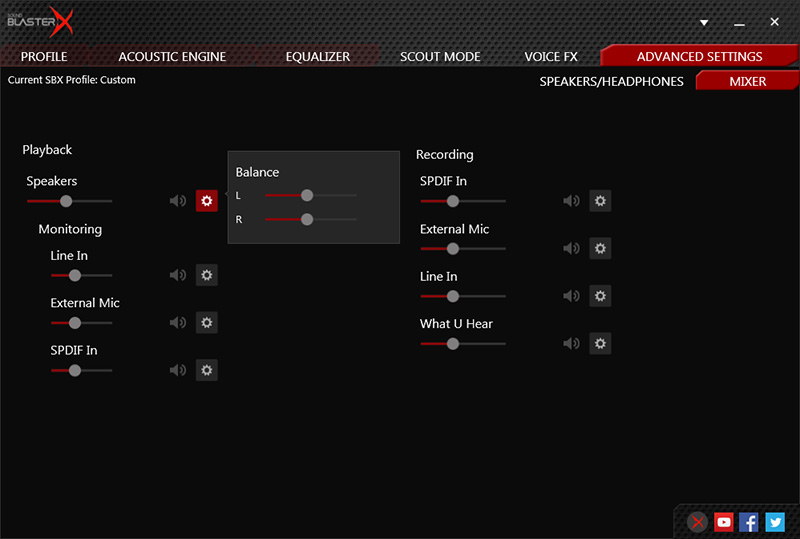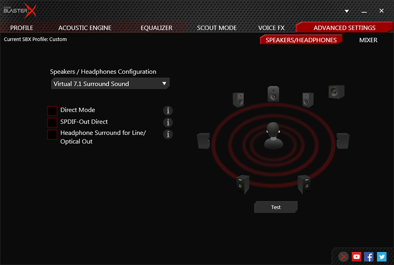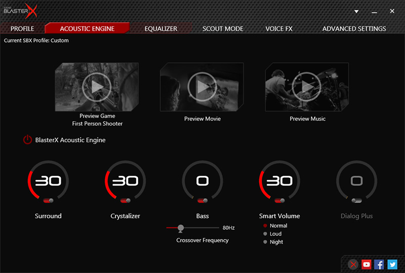 BlasterX Acoustic Engine Proソフトウェアには、様々なゲームジャンルのオーディオプロファイルや、特定ゲーム向けのオーディオプロファイルがあらかじめプリセットされており、Sound BlasterX G5に3つまでのプロファイルを記憶させることが可能。