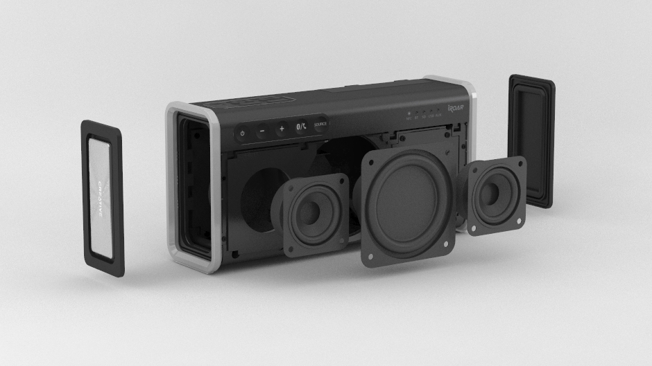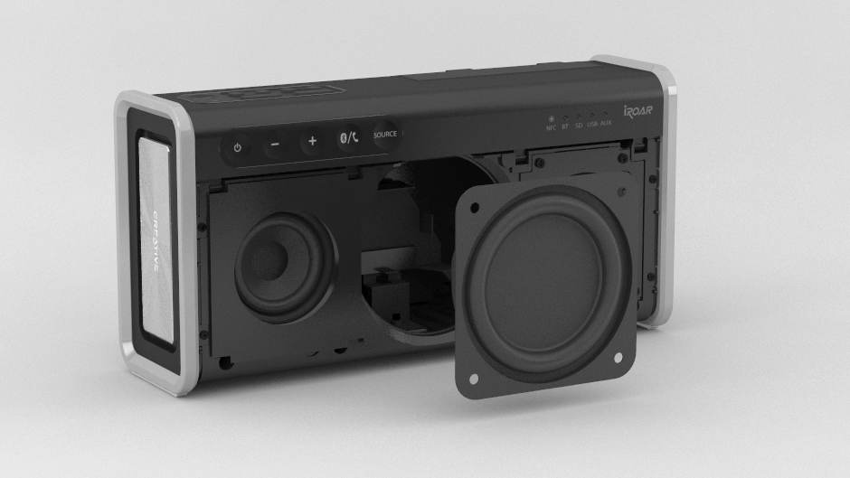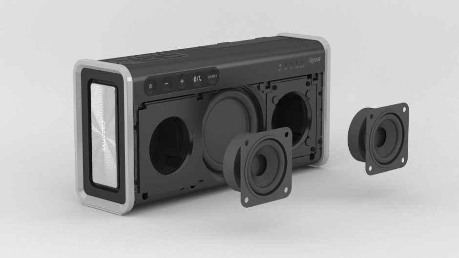 フラッグシップモデルのCreative iRoarに比べ、iRoar Goはおよそ40%小さく、25%軽くなりました。スピーカーはパワフルな重低音とともに躍動する美しい光沢仕上げのマシンフィニッシュのパッシブラジエーターを両サイドに備え、精悍なアルミニウム リングとともに気品を添えています。