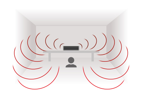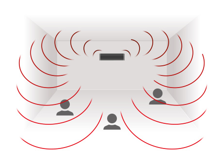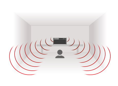 ドライバーが上向きになるように部屋の天井近くにスピーカーを平置きにすることによって、1つのスピーカー システムからのサウンドであっても部屋全体を取り巻くスピーカーから音が聞こえるような、部屋のどこにいてもリスナーを音で包み込むようなオーディオを体験できます。