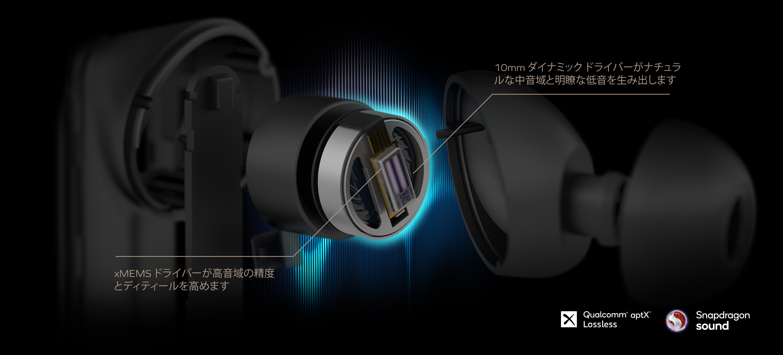 xMEMS ドライバーと10mm ダイナミック ドライバーのハイブリッド構成を採用しており、xMEMS ドライバーによる一貫性のある優れたオーディオと、5Hz~40kHzの広帯域な周波数特性によって、明瞭な高音質オーディオをお届けします。