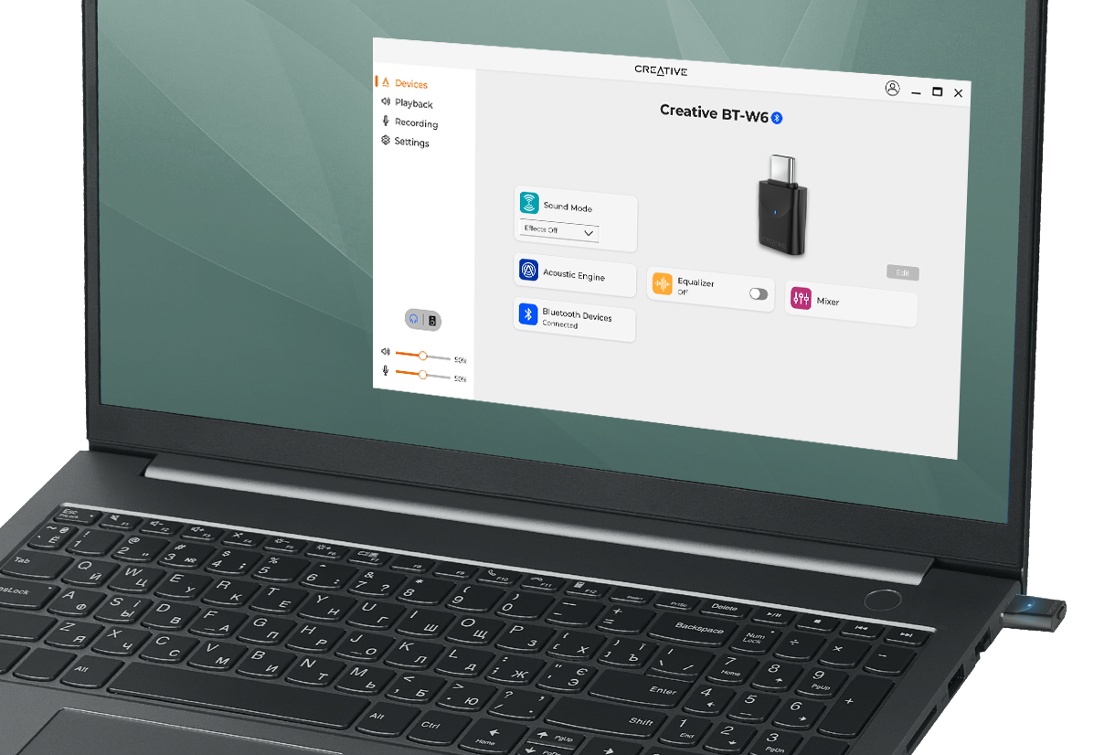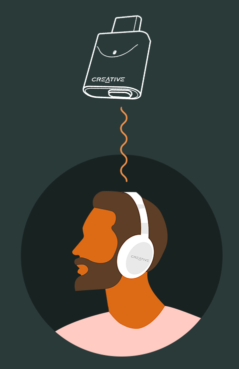Creative BT-W6はワイヤレス ヘッドセットからのマイク入力に対応しており、アプリケーションやソフトウェアによるボイス通話時にマイク入力を自動検出※7します。マイク入力の自動検出はCreative アプリからオン/オフできます。