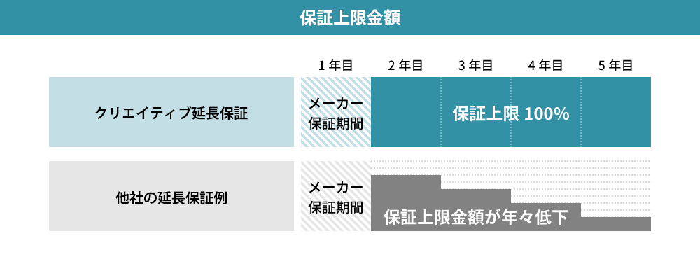Creative 延⾧保証サービス 5 年プラン G は、延⾧保証サービス対象製品のメーカー保証期間経過後も、同等の保証 を 5 年まで延⾧します。本延⾧保証サービスの保証上限金額は、商品金額(税込)までとなります。なお、保証上限金額は延⾧保証終了まで低下しません。