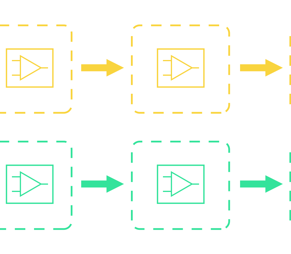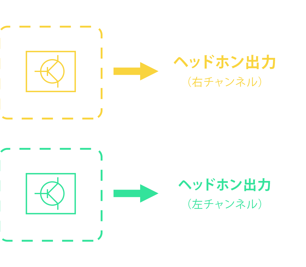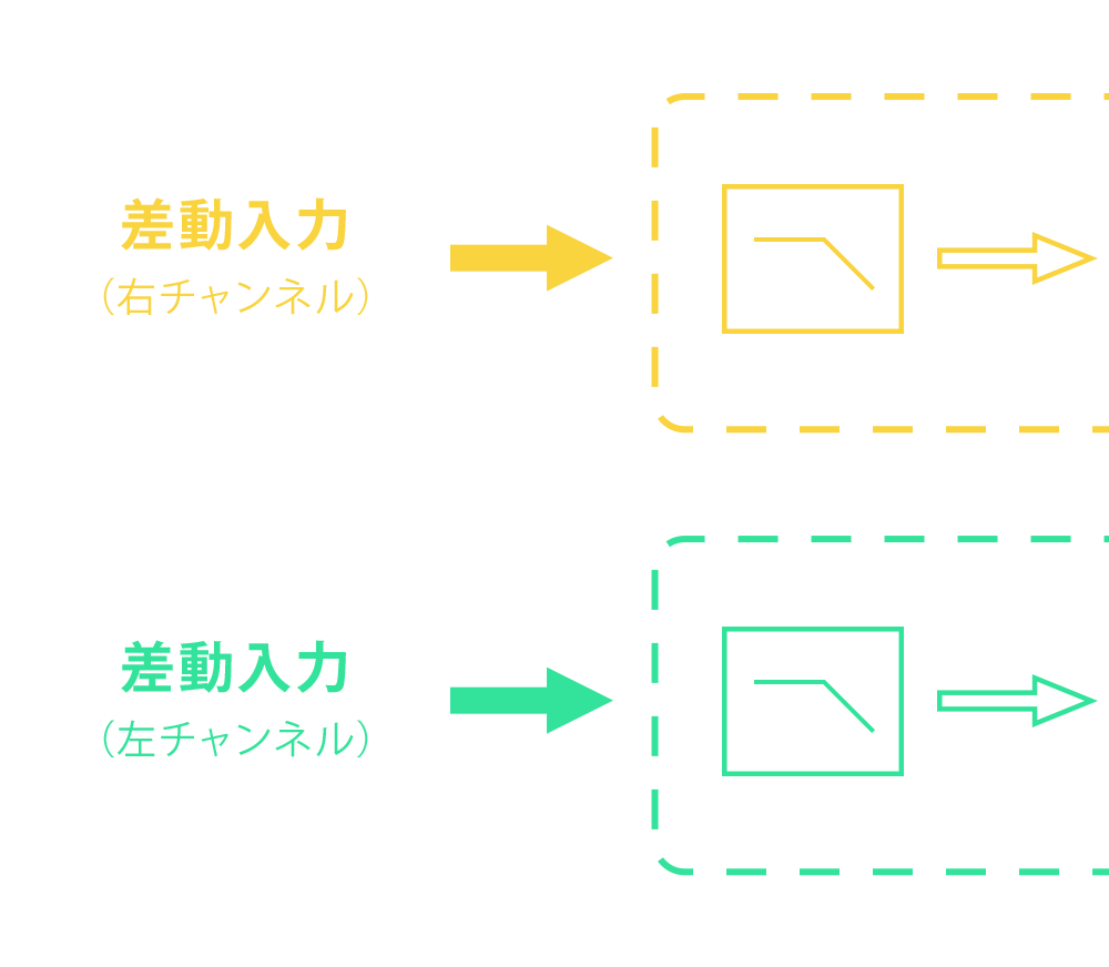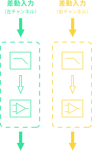 左右の各オーディオ チャンネルは、3段階の個別の増幅回路を通過します: