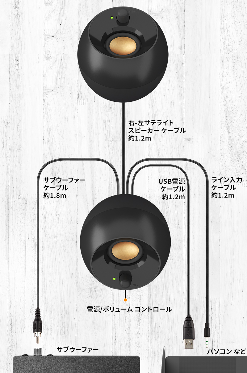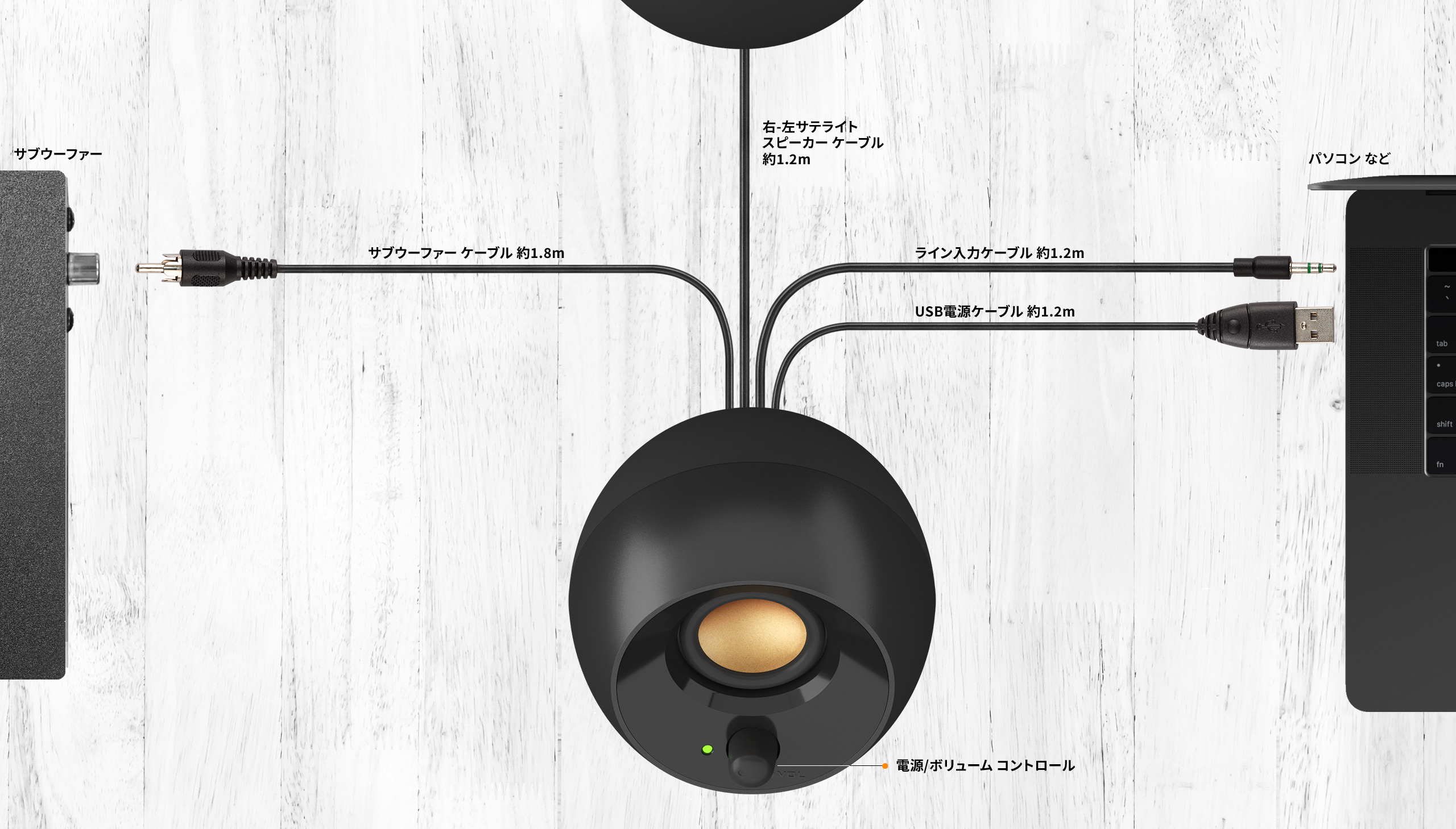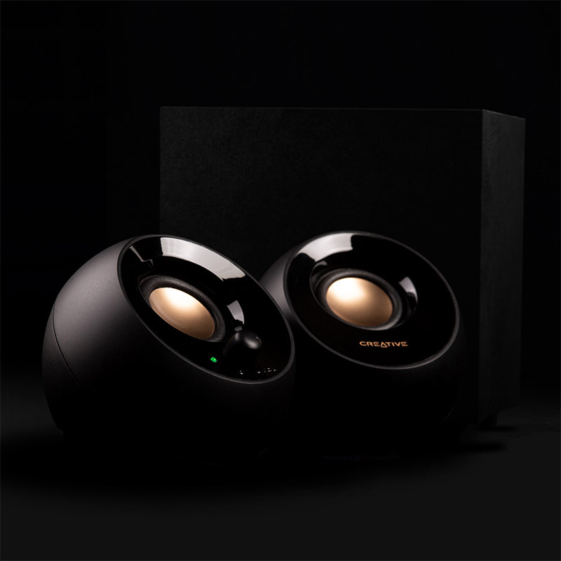 Creative Pebble Plusは、パーソナル リスニングに適したサウンド ステージを実現する球形状のサテライト スピーカーと、コンパクト サイズでダウンファイアリング サブウーファーを備えた、USBパワーで動作する2.1チャンネル スピーカーです。