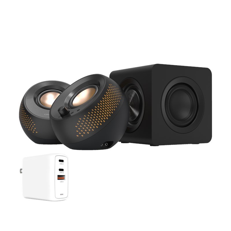 Creative Pebble X Plus 67W PD アダプターセットには、Creative Pebble X Plusの30W RMS/ピーク出力60W※1によるオーディオ パフォーマンスをフルに発揮するためのCreative 67W GaN Chargerが付属しています。
