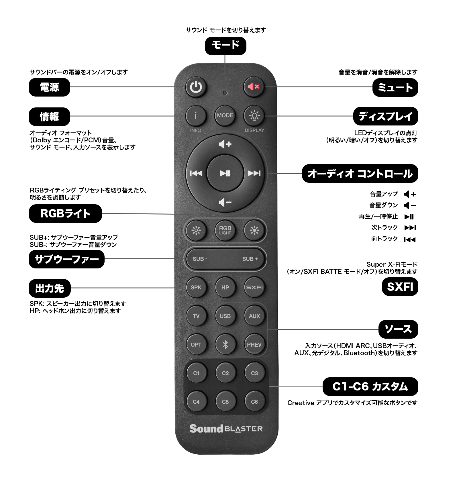 便利なワイヤレスリモコンが付属しており、音量やバス レベルの調整、オーディオ ソースの選択がお手元で操作できます。また、サウンド モードやRGBライティングを切り替えたり、Creative アプリでカスタマイズ可能なボタンC1-C6にアクセスできます。