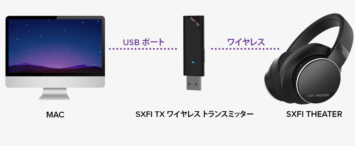 また、SXFI THEATERは、Bluetooth®に比べ高い信頼性を備えたより高音質のオーディオ伝送を行います。これは、Super X-Fi テクノロジーを駆動するUltraDSP内蔵のワイヤレスUSBドングル SXFI TX(USB Type-A)と、独自のデジタル オーディオ伝送技術によって可能になっています。また、SXFI THEATERの伝送範囲を延長するUSB エクステンション ドック(USB Type-A/約1.2m)が添付します。