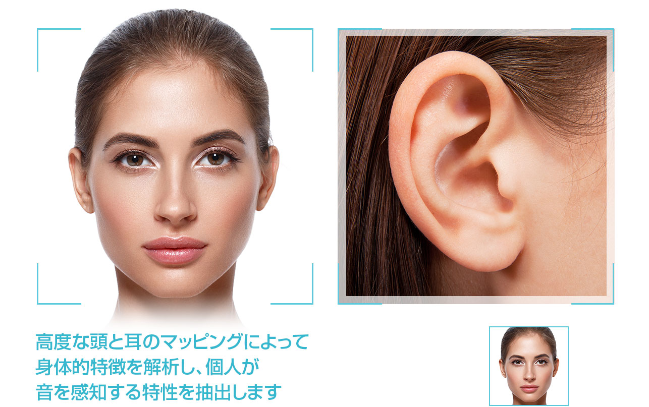 リアルタイムの画像検出/分析により多数の高精度画像から身体的な特徴をマッピングします。そして、AIエンジンが身体的特徴をヘッドホン ダイナミクスと共に抽出して3次元空間の音響マッピングと合成します。