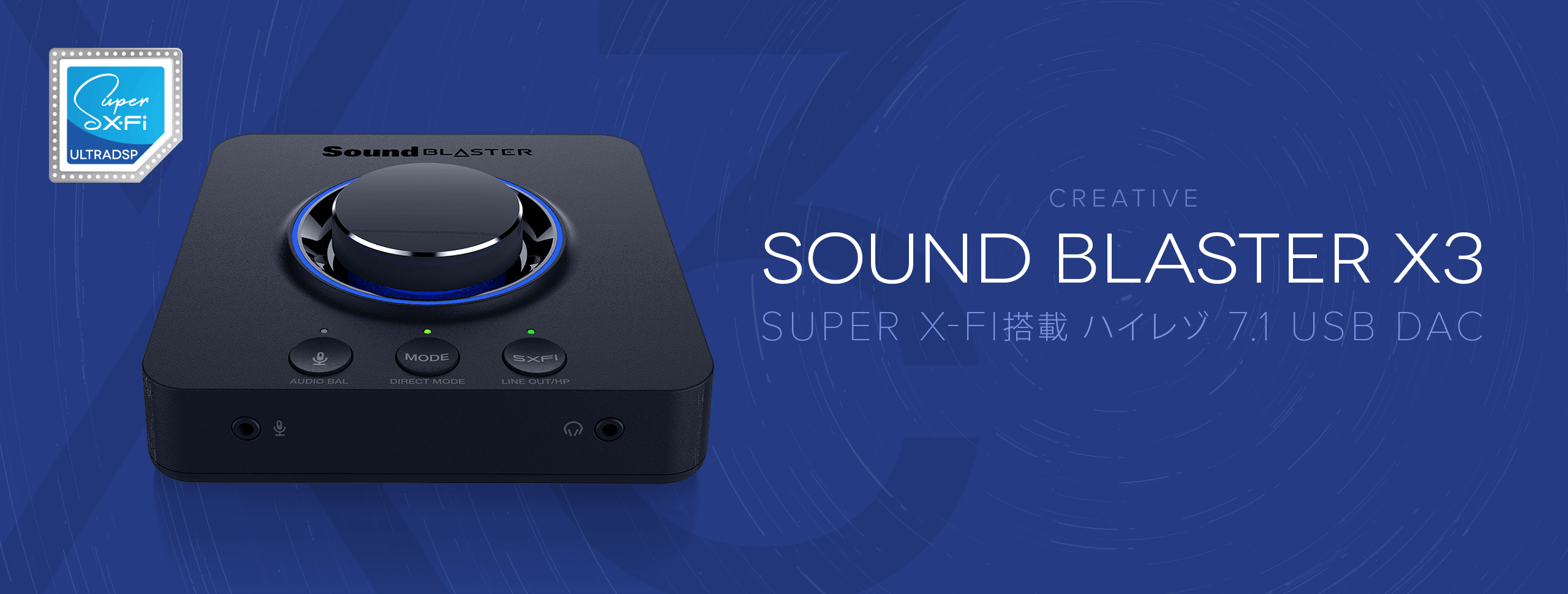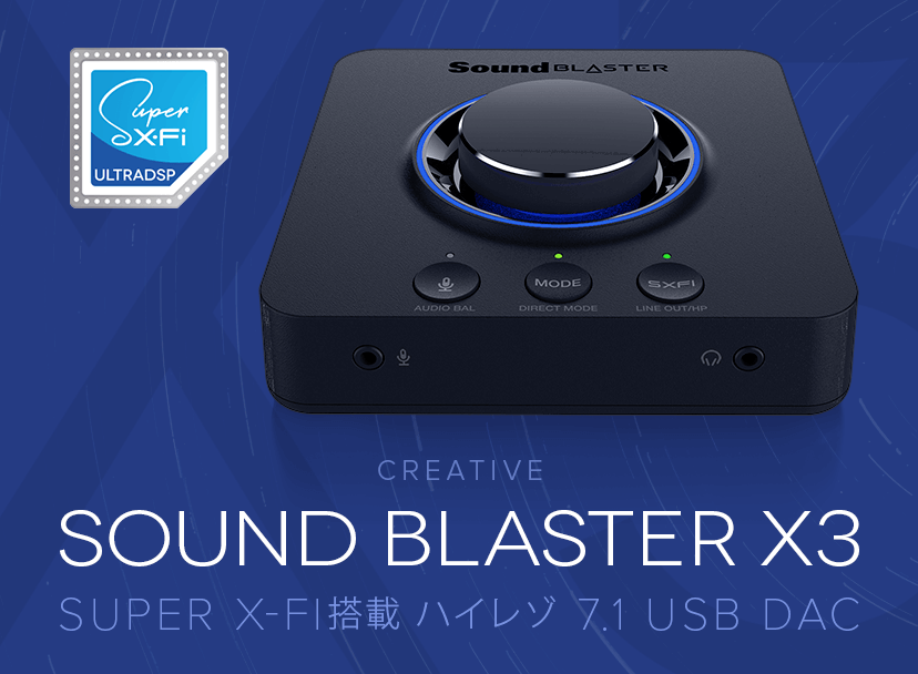 PCでの最大7.1ch再生に対応しSuper X-Fiによるヘッドホン ホログラフィ オーディオの再生とディスクリート7.1スピーカーによるサラウンド再生に対応、最大32bit/192kHzハイレゾ再生にも対応する外付USB DACです。